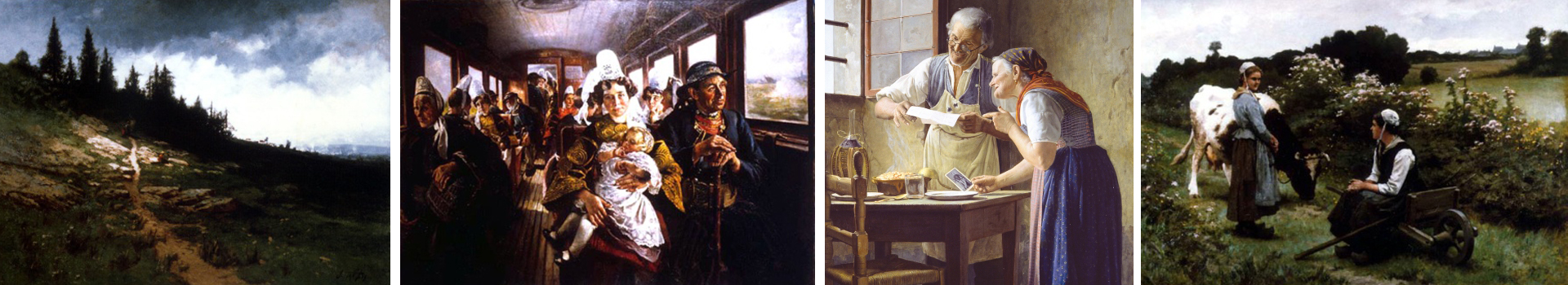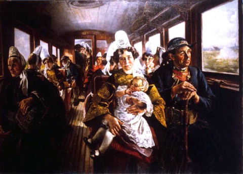 In Max Silbert’s painting Brittany Peasants Return from the Fete, a group of people dressed in their finest traditional costumes are traveling by train. Silbert and other turn of the century artists flocked to the remote region of Brittany on the northwestern coast of France to paint the people and countryside unspoiled by modern life. Here, he has presented the traditional culture of Brittany in an ironic mix with the progress of the early twentieth century.