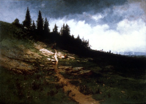 Landscape with Figures is an example of the artist’s ability to create atmospheric effects in nature that evoke mood in his paintings. In this picture, dark gray clouds hovering over a hillside scene with figures suggest an impending thunderstorm. To the right a city with smokestacks and a church steeple can be seen in the distance. Perhaps Rix has presented a view of the industrial city of Paterson in the late nineteenth century.