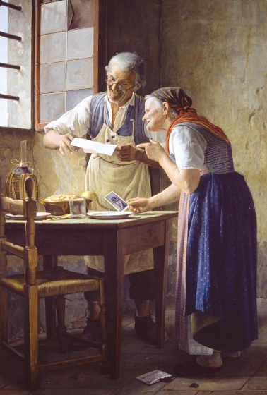 News from the Front is a superb example of Aurelio Zingoni’s interest in naturalism and his preference for themes from ordinary daily life. True to his style, the artist has created a sensitive genre scene with amazing detail, order, and harmony.