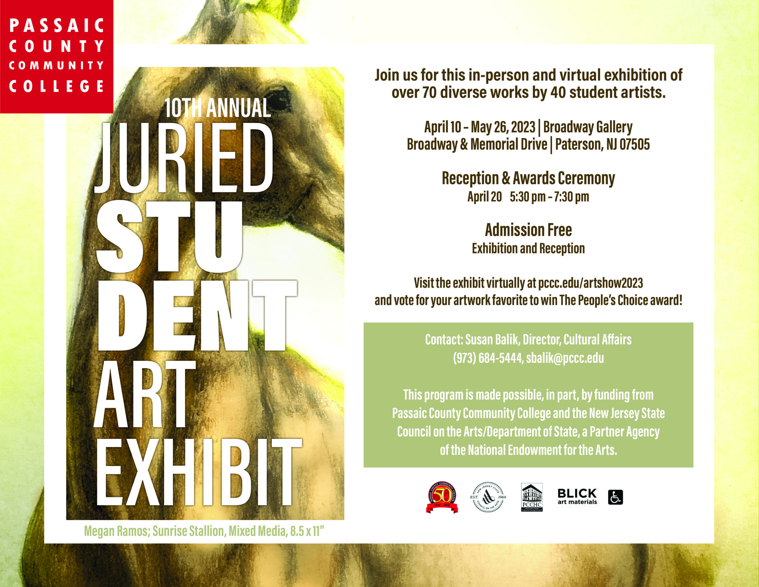 Join us Thursday, April 20 from 5:30 – 7:30 pm at the Broadway Gallery (Main Campus-Paterson) to view the 10th Annual Juried Student Art Exhibition during the Artists’ Reception and Awards Ceremony. This year’s exhibit features a record 73 artworks by 40 student artists in mediums ranging from paintings, pencil drawings, and photography, to digital art, animation, and more. Enjoy refreshments, meet the student artists, and attend the Awards Ceremony. Entrance to the Broadway Gallery is at Broadway and Memorial Drive in Paterson. Admission to the Gallery and Reception is free. The exhibition will remain on display in the Gallery until May 26 and virtually at pccc.edu/artshow2023. Visitors to the virtual exhibit may also vote for their favorite artwork to receive the People’s Choice award which will be announced on May 3.