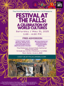 [Paterson, New Jersey]– Festival at the Falls – A Celebration of World Cultures will take place on Saturday, May 31, 2025. The Folklife Center of Northern New Jersey at Passaic County Community College is sponsoring this free event, which will take place from 1 – 4 p.m. at Overlook Park at the Paterson Great Falls Historical Park, 72 McBride Ave. Ext. The rain date is June 1st.