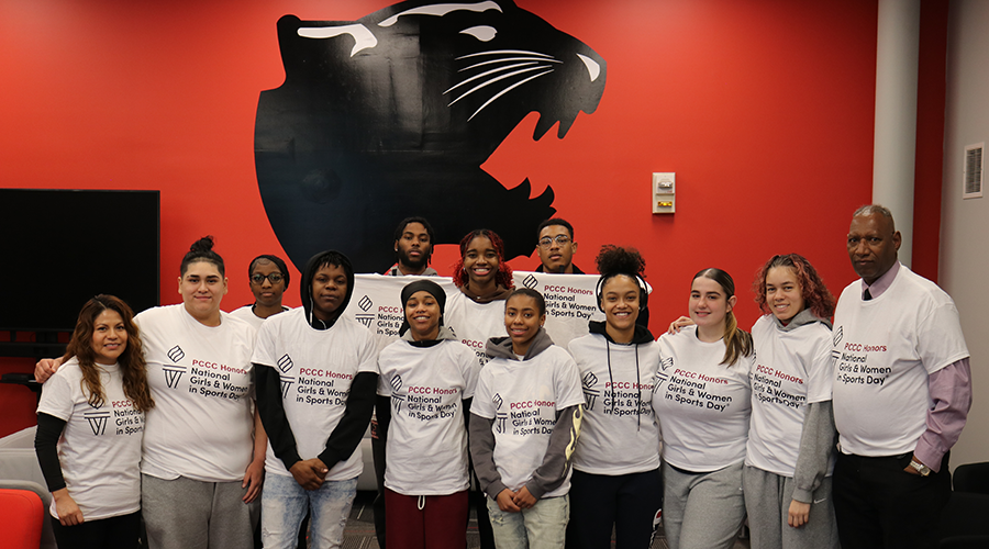 Celebrating PCCC’s women athletes in basketball and volleyball, the event was upscaled with rsvp invitations, special NGWSD t-shirts, plentiful refreshments, and a gathering in PCCC’s lively Panther’s Den.